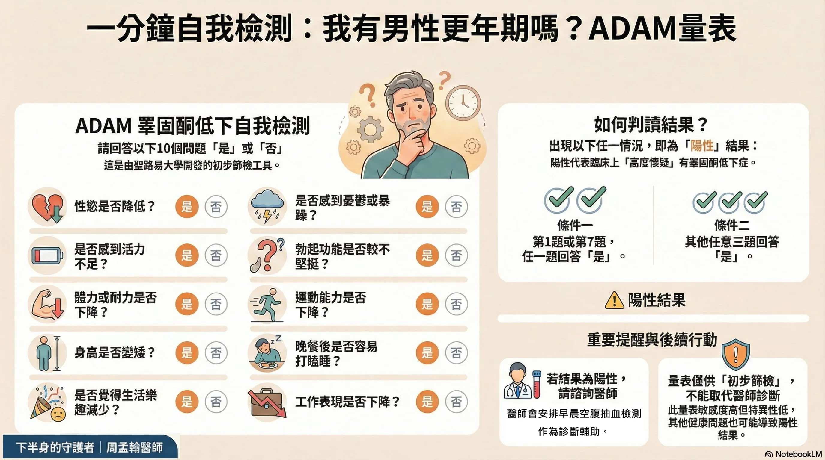 臨床上常使用 ADAM 問卷(Androgen Deficiency in Aging Males)作為初步篩檢工具;若評估結果懷疑,通常會安排「清晨 7–10 點、空腹抽血」,測量「總睪固酮(Total Testosterone)」以釐清病因。