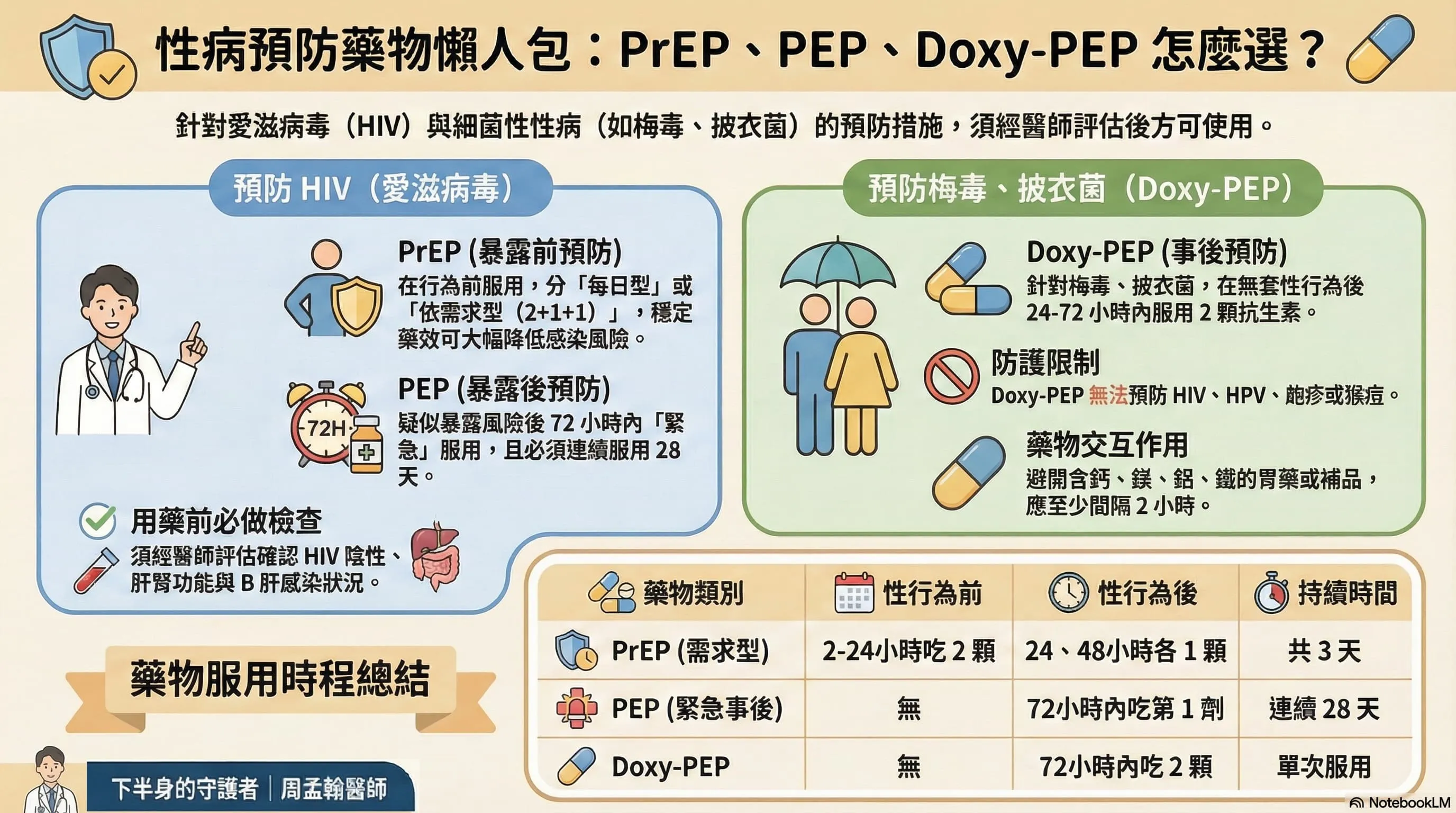 性病藥物預防可分為 HIV 的 PrEP、PEP,以及細菌性性病的 Doxy-PEP。本文整理適用對象、服用時機、副作用與追蹤重點。