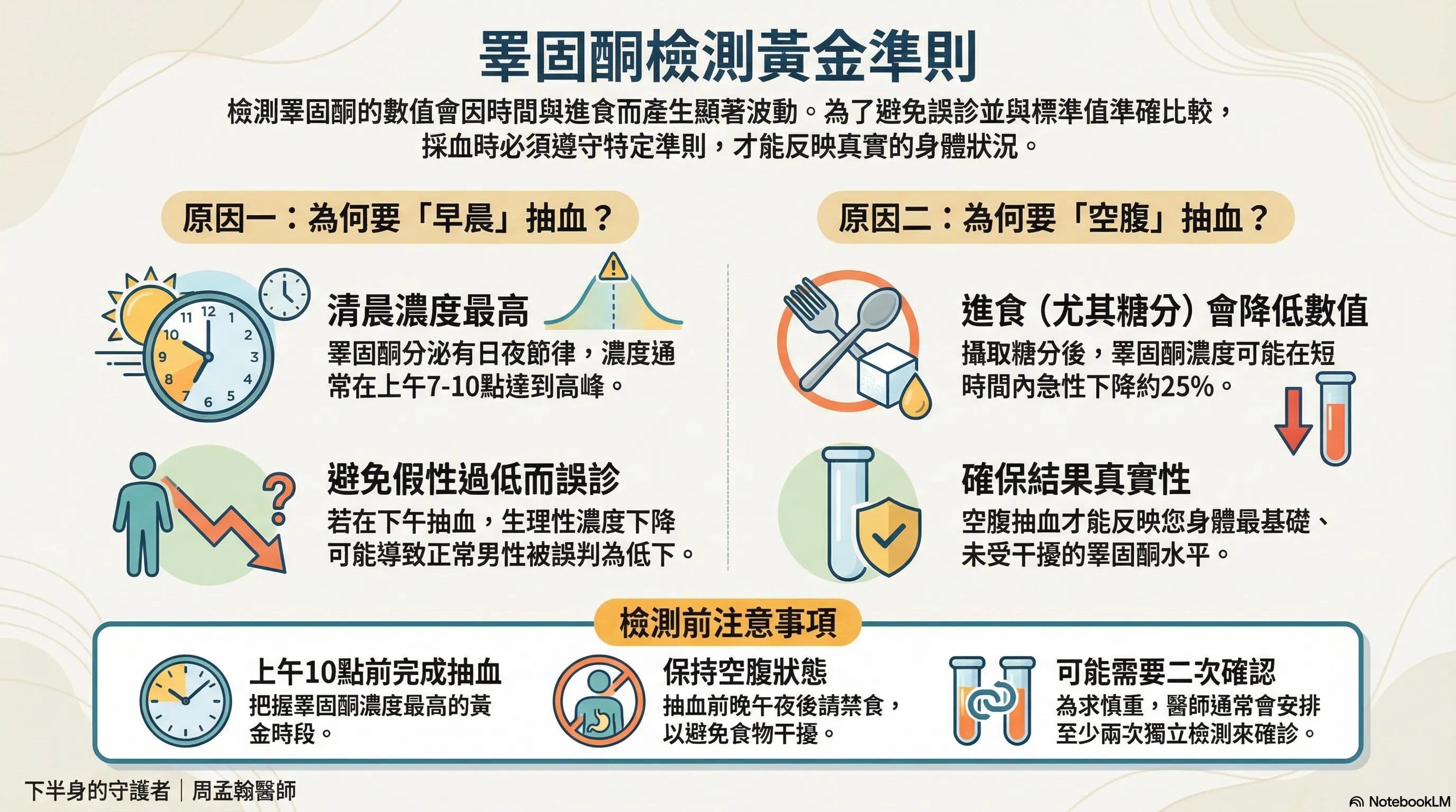 臨床上常使用 ADAM 問卷(Androgen Deficiency in Aging Males)作為初步篩檢工具;若評估結果懷疑,通常會安排「清晨 7–10 點、空腹抽血」,測量「總睪固酮(Total Testosterone)」以釐清病因。